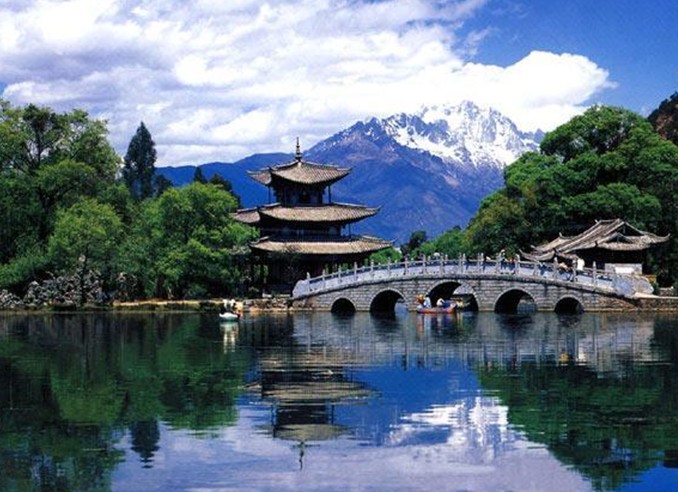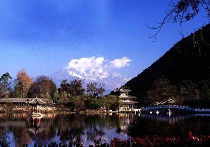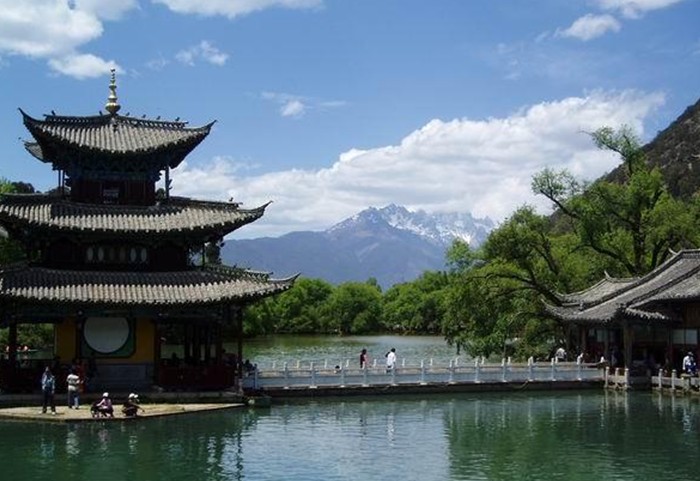 云南麗江黑龍?zhí)叮蝴惤邶執(zhí)队置袢珗@,位于城北象山腳下,從古城四方街沿經(jīng)緯縱橫的玉河溯流而上,約行一公里有一處晶瑩清澈的泉潭,即為中外聞名的黑龍?zhí)?。潭水從石縫間涌涌噴出,依山斛清泉匯成四萬平方米潭面。四周山清水秀,柳暗花明。依山傍水造型優(yōu)美的古建筑點(diǎn)綴其間。其流韻溢彩,常引人駐足留連。