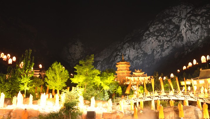 千米大佛頌和諧。在演出尾聲部分,版權(quán)所有山東聊城聊之旅國際旅行社有限公司,轉(zhuǎn)載必究!主創(chuàng)人員設(shè)計了一個特殊的章節(jié):用燈光把作為演出背景的少室山連天峰打成一尊大佛,由于距離遠、面積大、山體不平整等原因,觀眾一直無緣見到這尊“大佛”,如今演出方斥資300萬元進行科研攻關(guān),使大佛特效呈現(xiàn)。