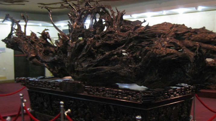《中華根展覽》是由千年古樟巨根雕制而成。它長6.30米,高2.30米,其狀屈曲崢嶸,其勢鳳翥龍蟠,是為“養(yǎng)在深閨人未知”之珍寶。它鐫刻著女媧補天、夸父追日、大禹治水、赤壁賦等遠古傳說,歷代史事,英烈忠魂,前修偉業(yè),煌煌五千年文明史,盡覽于一根。洋洋灑灑百余構(gòu)圖,故事經(jīng)典,場面恢宏,造型傳神,栩栩如生,嘆為觀止。四周星羅姿態(tài)各異精品根藝80余類,根造型、根拼字、根貼畫、根包石、竹蔸雕……品類繁多,琳瑯滿目。每件根藝標示牌均配以詩文,新穎別致,內(nèi)涵博深,耐人品味。觀者感慨:通觀此展,仿若閱讀一部歷史巨著,又似步入大千文學(xué)殿堂,更象闖進精美絕倫的藝術(shù)大觀園,不知不覺中,深受傳統(tǒng)美德和民族精神的熏陶。
