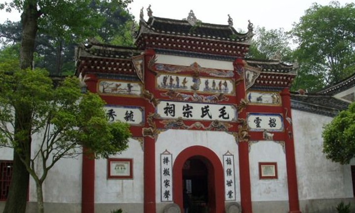 毛氏宗祠是韶山毛氏家族的總祠堂,始建于1758年,1763年建成。建筑系磚木結構,青磚青瓦,建筑面積約700平方米。宗祠大門天頭有"毛氏宗祠"四字。大門外兩邊各立一石鼓。
