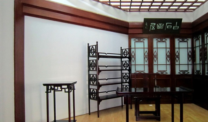 白石先生的畫室里陳列著白石大師曾用過的畫案即兩頭沉的硬雜木寫字臺(tái)(長(zhǎng)約1.4米,寬0.7米),案上擺有白石先生用過的毛筆、古硯、筆洗、平底小勺、刻刀、筆筒及蟋蟀斗等。墻上掛一幅白石作品水蓼草蟲。北面擺放硬木雕花大立柜,(高2米×1.2),西邊擺一個(gè)比那個(gè)小些的小立柜。門外掛一竹簾,看起來畫室極其簡(jiǎn)樸。再看齊白石先生創(chuàng)作成百上千萬元的精品力作,用過的毛筆也并不出奇,畫案筆架上擺放著三只毛筆,一只是純羊毫大門斗,兩只中楷兼毫筆,筆桿都是普通竹桿,案頭右邊還放著一只更大一些關(guān)毫筆,都很普通,看來當(dāng)時(shí)做畫的條件太差了,如果有現(xiàn)在這個(gè)條件和環(huán)境,白石大師創(chuàng)作的精品還要多的多。