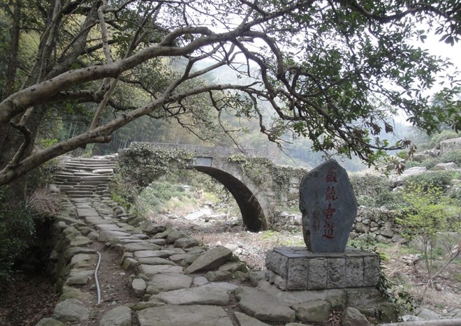 徽饒古道歷來(lái)是古徽州通往饒州的交通要道,昔日徽商享譽(yù)大江南北,徽州古道功不可沒(méi)。此古道從梅嶺村前的河對(duì)岸一直通向貫穿虎頭山,連接皖贛兩省,10公里,寬三尺,進(jìn)入安徽可到休寧、屯溪,全部由麻石鋪砌而成。踏著蜿蜒古樸的山道,觀賞著蒼勁古木,蔥翠竹海,傾聽著寧?kù)o之中的聲聲鳥鳴,別有一番情趣。