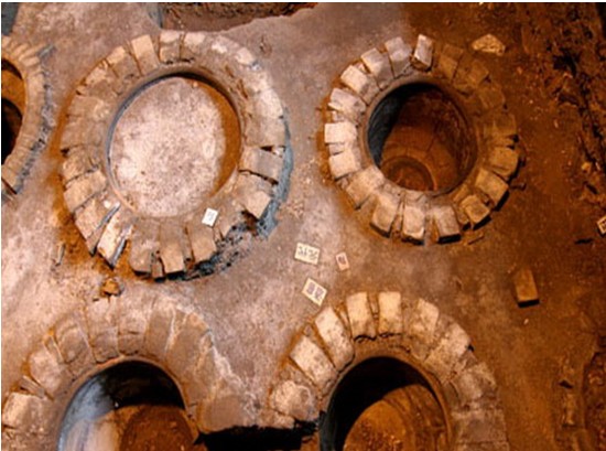 遺址位于李渡鎮(zhèn)紅石橋李渡酒廠老廠區(qū)內(nèi),元代至近現(xiàn)代燒酒作坊遺址。遺址考古勘探面積1600平方米,2002年考古發(fā)掘面積300平方米。揭露的文化堆積主要為元、明、清遺跡與遺物。其文化堆積的11個(gè)層面分為南宋、元、明、清、近代、現(xiàn)代6個(gè)時(shí)期,未見南宋遺跡,其余5個(gè)時(shí)期的釀酒遺跡有水井、爐灶、晾堂、酒窖、蒸餾設(shè)施、墻基、水溝、路面、灰坑、磚柱等。水井位于遺跡中心部位,始建于元代,后經(jīng)增高,深4.25米,六邊形紅麻石井圈,口徑0.66-0.72米,井臺三合土筑。爐灶始建于明代,紅石與青磚砌,長徑2.80米,短徑1.42米,殘高1.98米,煙道位于頭端兩側(cè);灶前操作坑呈“凹”字形,長2.70米,寬1.60米,深1?84米。晾堂2處,明代晾堂50平方米,清代晾堂40平方米,卵石與三合土筑,表面不平,邊界用紅石砌。酒窖22個(gè),其中元代酒窖13個(gè),直徑約0.65-0.95米,深約0.56-0.72米;明代酒窖9個(gè),有6個(gè)至今仍在使用,直徑0.9-1.1米,深約1.52米。