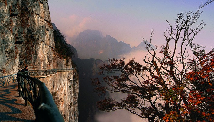 玻璃棧道是2011年9月份完工的一個(gè)貼山懸空玻璃過道。位于天門山鬼谷棧道起始位置500米處,這里是一個(gè)岔路口,對(duì)于喜歡刺激點(diǎn)的,可以選擇這樣走過,反之可以繞旁邊的石道而過。它采用堅(jiān)硬的鋼化玻璃,周圍有金屬欄桿,腳下就是透明的玻璃,與峽谷底部的相對(duì)高度是近400米。從上面走過,能煉膽。膽小者勿去