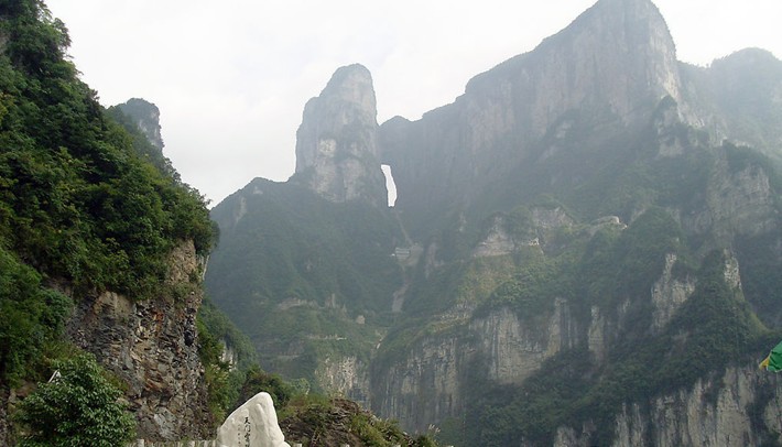 天門山,古稱云夢(mèng)山、嵩梁山,是張家界永定區(qū)海拔最高的山,距城區(qū)僅8公里,因自然奇觀天門洞而得名,最早被記入史冊(cè)的名山。三國(guó)吳永安六年(公元 263 年),嵩梁山忽然峭壁洞開,玄朗如門,形成迄今罕見的世界奇觀――天門洞,從此而得名天門山。山頂相對(duì)平坦,保存著完整的原始次生林,有著很多極為珍貴和獨(dú)特的植物品種,森林覆蓋率達(dá)90%。其間古樹參天,藤蔓纏繞,青苔遍布,石筍、石芽舉步皆是,處處如天成的盆景,被人譽(yù)為世界最美的空中花園和天界仙境。2012年7月22日中午,法國(guó)輪滑大師讓伊夫•布朗杜挑戰(zhàn)天門山。