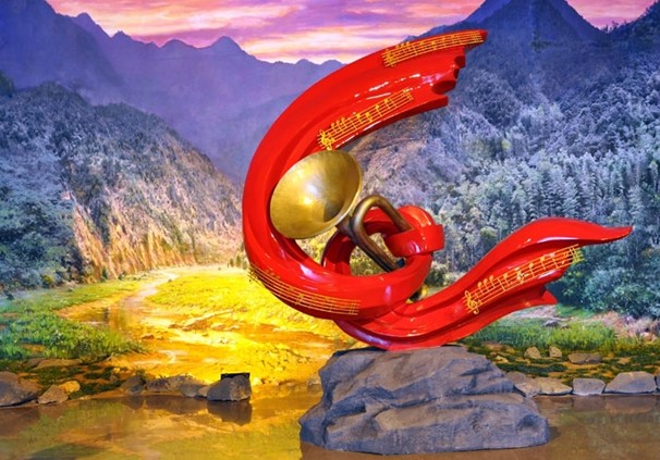 走進(jìn)新館,映入眼簾的是一個面積600平米,高9米的展覽序廳,最引人注目的是氣勢如虹的主題背景。據(jù)悉,背景油畫由清華美院師生集體創(chuàng)作,面積為600平方米,為我國目前最大的油畫。序廳是一個由巨幅油畫、主題圓雕和實(shí)體山景組合而成的大型多媒體景觀,主題鮮明,氣勢恢弘。