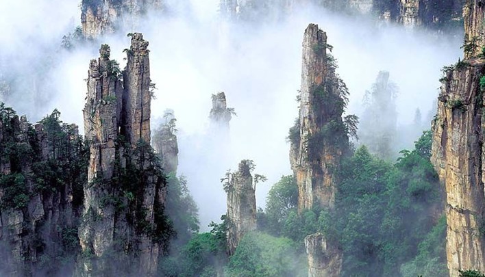 武陵源獨(dú)特的石英砂巖峰林在國(guó)內(nèi)外均屬罕見(jiàn),素有“奇峰三千”之稱。在217.2平方公里的核心景區(qū)中,有石英砂巖山峰3103座,峰體分布在海拔500-1100米,高度由幾十米至400米不等。峰林造型若人、若神、若仙、若禽、若獸、若物,變化萬(wàn)千,這些突兀的巖壁峰石,連綿萬(wàn)頃。每當(dāng)雨過(guò)天晴或陰雨連綿天氣,山谷中生出的云霧繚繞在層巒疊嶂之間,云海時(shí)濃時(shí)淡,石峰若隱若現(xiàn),景象變幻萬(wàn)千。