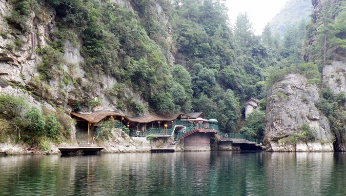 湖中有兩座疊翠小島,近岸奇峰屹立,峰回水轉(zhuǎn)。泛舟漫游,只見一湖綠水半湖倒影,充滿詩情畫意。“云梯萬丈上天臺(tái),高峽平湖一鑒開,王母瑤池金扶,浣沙仙女下凡來”游寶峰湖,你就會(huì)欣賞到這樣的詩情畫意。群峰擁抱的寶峰湖,長(zhǎng)約2.,5公里,湖猶如一面寶鏡,四面青山,一泓碧水,蕩槳溫游,格外愜意。坐在船上,環(huán)顧四周,千山聳翠,俯視水中,倒影慢移,碧水照相館得群峰綠,人面桃花水映紅。真是靜極了,美極了!韓劇《九天洞》拍攝的湖水就是寶峰湖。