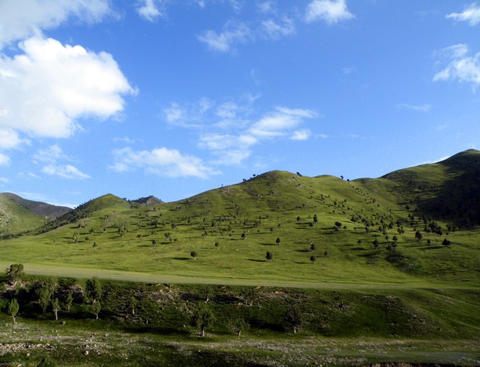柏樹(shù)山環(huán)境優(yōu)雅,景色迷人,是一處旅游佳境。遙看柏樹(shù)山,滿山遍野的柏樹(shù)傲然而立,山上"草色近看遙卻無(wú)"。上得山來(lái),峰巒溝壑,碧草如茵,山峁丘陵處處都是優(yōu)良的天然牧場(chǎng),一派"春來(lái)草色一萬(wàn)里"的壯麗景色。