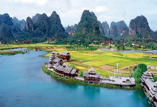 陽(yáng)朔“世外桃源”主要有荷花池、燕子湖、燕子洞、侗鄉(xiāng)風(fēng)情和原始部落組成。若是“沾衣欲濕杏花雨,吹面不寒楊柳風(fēng)”的季節(jié).踏進(jìn)“世外桃源”,展現(xiàn)在眼前的將是一片秀美的山水田園風(fēng)光。清波蕩漾的燕子湖鑲嵌在大片的綠野平疇之中,宛如少女的明眸脈脈含情。湖岸邊垂柳依依,輕拂水面。一架巨大的水轉(zhuǎn)筒車,吱吱呀呀地?fù)u著歲月,也吟唱鄉(xiāng)村古老的歌謠。放眼望去,遠(yuǎn)方群山,村樹含煙,阡陌縱橫,屋宇錯(cuò)落,宛若陶淵明筆下“芳草鮮美,落英繽紛”“有良田美池桑竹之屬”的桃源畫境。