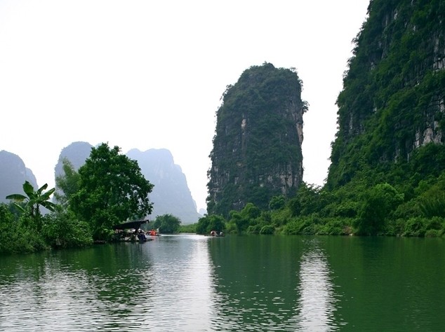 遇龍河兩岸青山連綿,造型各異,百態(tài)千姿;一路翠竹夾道,綠樹成行,芳草萋萋;而若遇晴日,則藍天白云,碧水綠草,開朗而明快;若逢雨天,更是霧繞云遮,百媚千嬌。假若把漓江比作風(fēng)情萬種的大家閨秀的話,那么,遇龍河就更應(yīng)該是小家碧玉了。