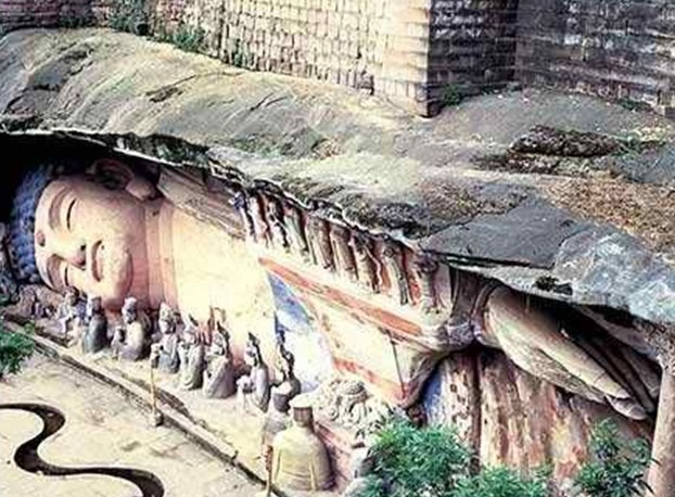 寶頂山造像以大佛灣為中心。大佛灣狀若馬蹄形.版權(quán)所有山東聊城聊之旅國(guó)際旅行社有限公司,轉(zhuǎn)載必究!全長(zhǎng)500米。全部造像精心規(guī)劃,宛如一幅巨型畫卷。號(hào)稱“世界第四大臥佛”《釋迦涅磐圖》就在這里。這尊臥佛作半身處理,雙腳似乎伸進(jìn)南巖中,使臥佛雖形半身,卻有全身之妙。這種意到筆不到的表現(xiàn)效果,正富于傳統(tǒng)藝術(shù)的含蓄美。有趣的是,臥佛頂?shù)乃刂校€刻有一雙兩公尺的足印,傳說這“是佛去西天留下的最后足印,亦是大足縣名之由來。