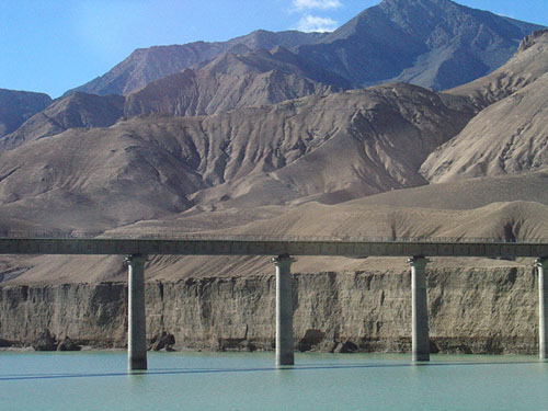 格爾木河上氣勢(shì)雄偉的格爾木水電站被稱為昆侖山下的明珠。格爾木河是柴達(dá)木盆地南緣的一條大河,昆侖山峰攝的冰雪夏日消融,它挾帶著營(yíng)水奔騰咆哮。它的背后是一個(gè)碧波閃閃的人造水庫(kù),庫(kù)容為四百多萬(wàn)立方米;它的前面是一條飛架嶙峋峽谷兩岸的凌空鐵索天橋,水庫(kù)的水從大壩的三扇泄洪閘門噴涌而出,猶如霰雪,又似瀑布,玉珠四濺,水霧飛騰。