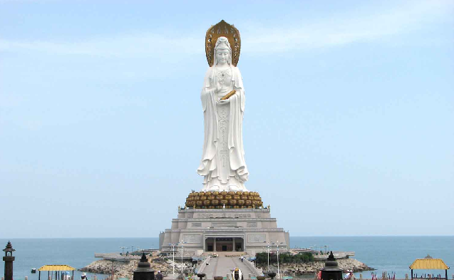 三亞南山海上觀音圣像敬造工程因其規(guī)模宏偉、意義殊勝、佛理底蘊(yùn)豐富,被譽(yù)為“世界級(jí)、世紀(jì)級(jí)”的佛事工程。像體為正觀音的一體化三尊造型,寶相莊嚴(yán),腳踏一百零八瓣蓮花寶座,蓮花座下為金剛臺(tái),金剛臺(tái)內(nèi)是面積達(dá)15000平方米的圓通寶殿。金剛洲由長(zhǎng)280米的普濟(jì)橋與陸岸相連,并與面積達(dá)60000平方米的觀音廣場(chǎng)及廣場(chǎng)兩側(cè)主題公園,共同組成占地面積近30萬(wàn)平方米的“觀音凈苑”景區(qū)。
