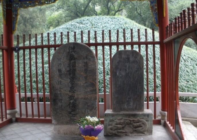 殿后大冢巍然,狀若覆斗,即為諸葛亮墓,冢高6米,周60米,四周以漢白玉石護(hù)欄圍護(hù),石欄上浮雕35幅“諸葛亮生平”故事圖案。冢前有四角攬頂式亭子一座,名曰前墳亭。亭角高翹,圍以木欄,亭內(nèi)高懸“雙桂流芳”匾額一塊,亭中堅(jiān)立墓碑兩通,一為明萬(wàn)歷甲午(公元1549年)陜西按察使金陵趙健所立的“漢丞相諸葛忠武侯之墓”的墓碑,一為清雍正13年(公元1735年)果親王立的“漢諸葛武侯之墓”碑。墓東西向,頭西腳東,取“永懷西蜀、興復(fù)漢室”之意。