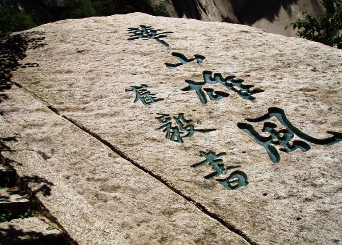 蒼龍嶺如一條橫臥在兩山之間的巨龍,在四周山色的映襯下,嶺下平臺酷似曲卷的龍尾,嶺盡處是懸石,如同回首怒吼的龍口。在龍口“云海”石刻下,肖四個圓,其中左側(cè)豎排的兩個只有圓周,而無圓心;但右側(cè)兩個既有圓周,又有圓心,為華山字謎之首,為“華山第一難題”。若細(xì)心悟之,象形文字中,圓表示“月”,圓中有點,表示“日”。據(jù)此石刻謎底為“二月二”日。俗有二月二龍?zhí)ь^之說,在龍口云海下刻此字謎,寓意希望蒼龍永遠(yuǎn)行云布雨,真是恰如其分,匠心獨有,精紗絕倫。