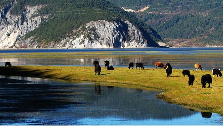 香格里拉納帕海位于中甸縣城西北部,距縣城8公里。保護(hù)區(qū)面積3125平方公里、海拔3266米、湖泊積水面積660平方公里。保護(hù)區(qū)地勢平坦,三面環(huán)山,冬春季節(jié),山嶺積雪。那曲河、奶子河等十余條河彎彎曲曲,流經(jīng)草源注入 納帕海。海西北面的辛苦雅拉雪女山麓有天然落水洞九處,洪水經(jīng)過溶洞,從尼西湯滿河排出、流入金沙江。每逢雨季、湖面增高、到旱季洪水排出、湖面縮小、大部分地區(qū)成為沼澤和草甸。