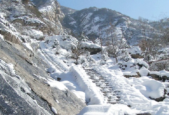 有壩高30余米,蓄水37萬立方的正岔水庫,湖光山色,繡色宜人,水庫北側(cè),兩處泄洪,形成兩條落差達25米的瀑布,寬達6米,在山崖上分三級落下;約200米的天池崩積堤上修起了約3米寬,由數(shù)百級石階砌成,長2000米,由下仰視,猶如登天梯,曲折回饒,人稱十八盤,每到秋季,柿葉早紅,盤道上紅葉迷人,剎是風(fēng)光;天池東側(cè)玉案峰,如玉案矗立,頗為俊秀;天池水色碧綠,群峰倒映,一片詩情畫意。