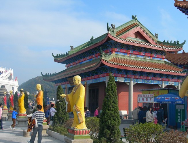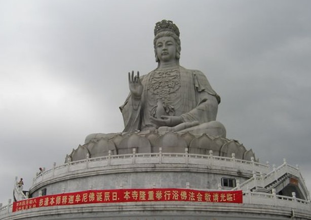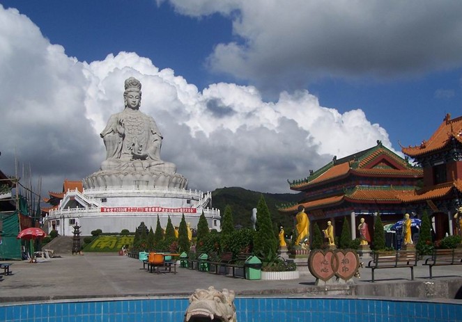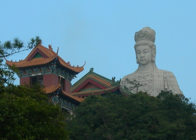 觀音廣場位于488米的觀音山頂,占地面積10000平方米,視野開闊,花繁葉茂,空氣清新,四季宜人。觀音菩薩圣像,就是目前全國乃至全世界最大的花崗巖觀音菩薩雕像。這尊觀音菩薩的圣像主題高33米,橫截面寬10.2米,體積有630立方米,總重3300噸,是由999塊0.5至8噸不等的福建蒲田優(yōu)質(zhì)花崗巖拼裝而成。圣像由國家一級雕塑師陳寶如設計,全部采用人工雕鑿,從1997年9月動工,至2001年6月竣工,歷時四年,總工日達98600個。