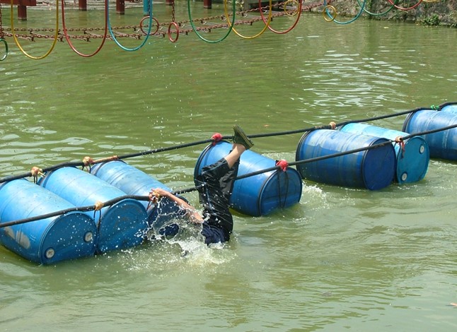 參訓(xùn)隊(duì)員必須從岸邊的起點(diǎn),利用空中的長(zhǎng)繩蕩到水面的兩個(gè)1平米的平臺(tái)上,一個(gè)平臺(tái)站滿(mǎn)人后再轉(zhuǎn)移到另一平臺(tái)上,每個(gè)平臺(tái)目前最多可站26人。訓(xùn)練各級(jí)人員相互理解、互相包容,相互支持與緊密合作,打破隊(duì)員之間、男女之間、部門(mén)之間的隔閡,勇創(chuàng)佳績(jī)的決心和勇氣。