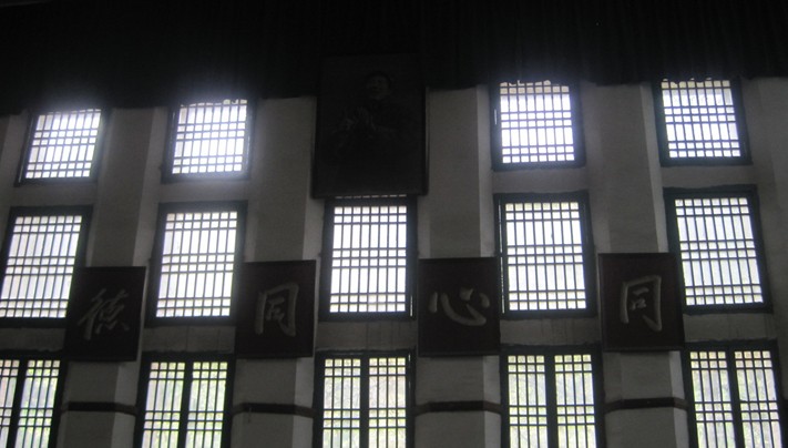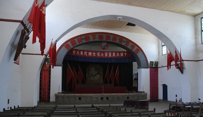 走進(jìn)中央大禮堂,里面的陳設(shè)仍然保持著66年前的風(fēng)貌。主席臺(tái)正中是毛澤東、朱德的巨幅畫(huà)像;會(huì)場(chǎng)后面墻上,懸掛著“同心同德”4個(gè)大字;兩側(cè)墻上懸掛4幅“堅(jiān)持真理”、“修正錯(cuò)誤”標(biāo)語(yǔ);靠墻邊插著24面紅旗,象征著中國(guó)共產(chǎn)黨24年奮斗的歷程;插紅旗的“V”字形木座是革命勝利的標(biāo)志;版權(quán)所有山東聊城聊之旅國(guó)際旅行社有限公司,轉(zhuǎn)載必究!在主席臺(tái)的正上方,懸掛著一條引人注目的橫幅:“在毛澤東的旗幟下勝利前進(jìn)!”