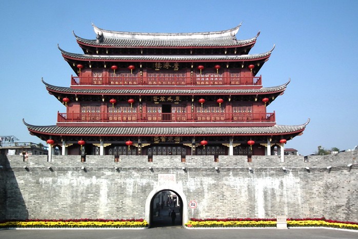 廣濟(jì)門城樓是一座宮殿式三層歇山頂閣樓,外城門原有“東為萬春”門額。樓置于高大厚實(shí)的臺(tái)基上,拱門中開,面闊七間,進(jìn)深五間,前后面為木石柱相銜接支撐,并跨出城墻外,成為騎樓。城樓為仿宮殿式建筑,重檐歇山頂,配以玻璃瓦紅彤壁,朱柱格子窗,畫棟雕梁,顯得雄偉壯觀。城樓中開拱門,高3.62米,寬2.9米。三樓懸巨型銅鐘1座,鑄于南宋紹興四年(1134)。