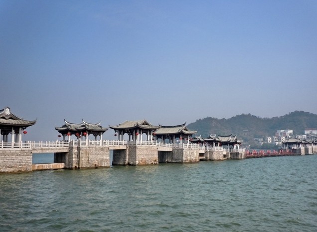 紹熙五年 (1194年),太守沈宗禹“皤石東岸”,筑“蓋秀亭”,并稱東橋為‘濟川橋’,接著,太守陳宏規(guī)、林驃、林會相繼增筑,至開禧二年(1206年)歷時十二年,建成橋墩十三座。東西橋建起來后,中間仍以浮舟連結(jié)之,形成了梁橋與浮橋相結(jié)合的基本格局。