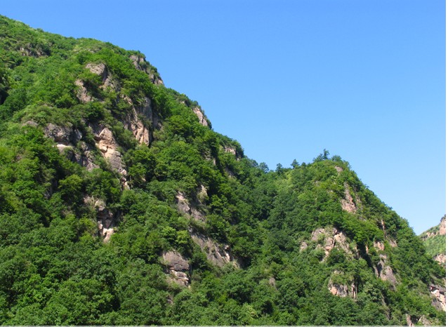進入胭脂峽口,漸往里走,樹木繁密、植物各異,景色也更加迷人。只因很少有人往來,所以道路狹窄難走。開始,還能找到一些崎嶇不平的羊腸小道,游人還能環(huán)顧山巒,目躍群峰。到后來,就只能穿梭于叢林之中,攀爬于陡坡之上,腳下是青苔綠階,頭頂是彎藤嫩枝,行路之艱難可想而知。