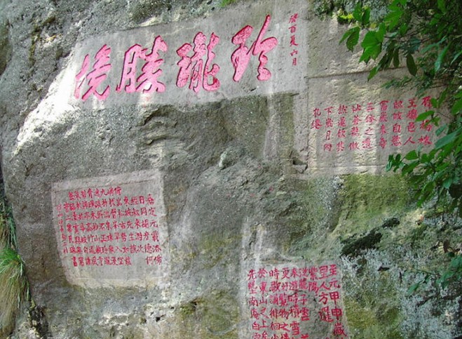盧陵王一乾的"玉柱天關(guān)"大字,正楷,陰刻,字大見方;還有"天風(fēng)海濤"、"觀海"(此石已毀)等石刻。諸家書法遒勁秀拔,各具一格,在書法藝術(shù)研究上有一定價(jià)值。