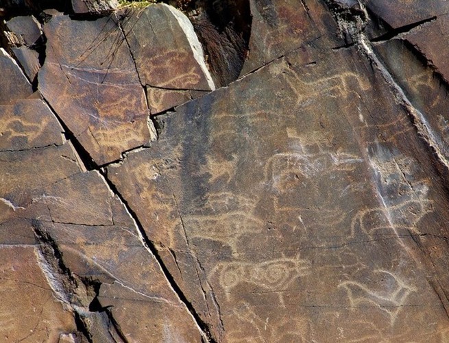 北側(cè)一處約9平方米的石塊上刻有50多個(gè)動(dòng)物畫像,有牛,馬,山羊,野豬,狐貍,部分動(dòng)物身上還刻有“萬”、“母”等不同形狀的紋飾,畫面形態(tài)大小不一,最長(zhǎng)的約0.30米,高約0.20米,最小的動(dòng)物長(zhǎng)0.05米。版權(quán)所有山東聊城聊之旅國際旅行社有限公司,轉(zhuǎn)載必究!畫面形象生動(dòng),動(dòng)物具有動(dòng)感;在中間的一處位于第一處之南側(cè),面積約7平方米,刻有7個(gè)動(dòng)物畫像,為牛羊,驢,老虎,狐貍,一般長(zhǎng)約0.06米-0.25米,高約0.05米-0.15米;一處在最南側(cè),面積僅3平方米,21個(gè)動(dòng)物畫像,以駱駝為,頭向一致,展示駱駝在沙漠里運(yùn)行的場(chǎng)面,此外尚有馬、牛、山羊、大頭羊、蛇等。