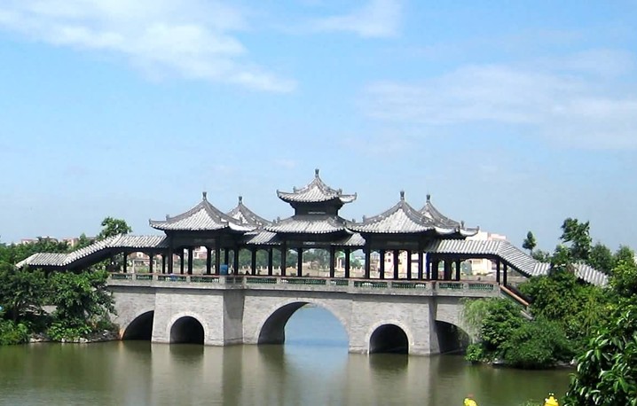 粵暉園歸水橋位于無(wú)香湖與映月湖交接的堤岸上,下設(shè)水閘,勢(shì)納東江,隨東江潮汐而變,換凈園水,永葆園內(nèi)水質(zhì)長(zhǎng)清,故稱歸水橋。有詩(shī)為證:“橋自東江歸碧水,園從正道入青蚨”。歸水橋獨(dú)具嶺南特色,形象豐富。橋上架五亭如梅花布置,橋身用青石砌成,下由十二個(gè)大小不同的橋墩組成十五孔,平面呈“工”字形,兩側(cè)加階梯,橋面上矗立琉璃攢尖方亭五座,正中的主亭為重檐,其四角為單檐。每逢月滿,從正側(cè)橋孔觀望,每洞各映一月,金色晃動(dòng),眾月襯橋,使湖景更為美麗。歸水橋也是接通繞翠廊的關(guān)口,橋面相對(duì)前園高出3米多,這樣即使無(wú)香湖四周景觀高低起伏,又使繞翠廊有層次感,高低疊立,倚橋亭遠(yuǎn)眺,視野開(kāi)闊,園內(nèi)美景盡收眼底。正是“水應(yīng)園生,園因水活”。