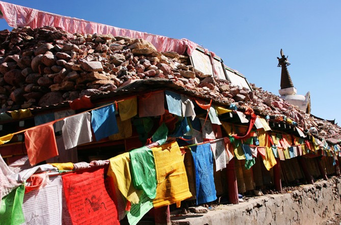 在青海省玉樹藏族自治州政府所在地結(jié)古鎮(zhèn),乘上3路公交車,大約20分鐘就到了新寨村,這里有世界上最大的瑪尼堆——新寨瑪尼城。新寨瑪尼城建于公元1715年,奠基人為第一世加納活佛宗求帕文,所以也稱為“加納瑪尼堆”?,斈岫言诓卣Z中稱“多崩”,意為“十萬經(jīng)石”的意思。占地有兩個(gè)足球場大小的新寨瑪尼城,版權(quán)所有山東聊城聊之旅國際旅行社有限公司,轉(zhuǎn)載必究!南部是新寨寺,其他各個(gè)方向均用瑪尼石堆砌成墻,在高高的圍墻高處還布滿了隨風(fēng)飄舞的經(jīng)幡。
