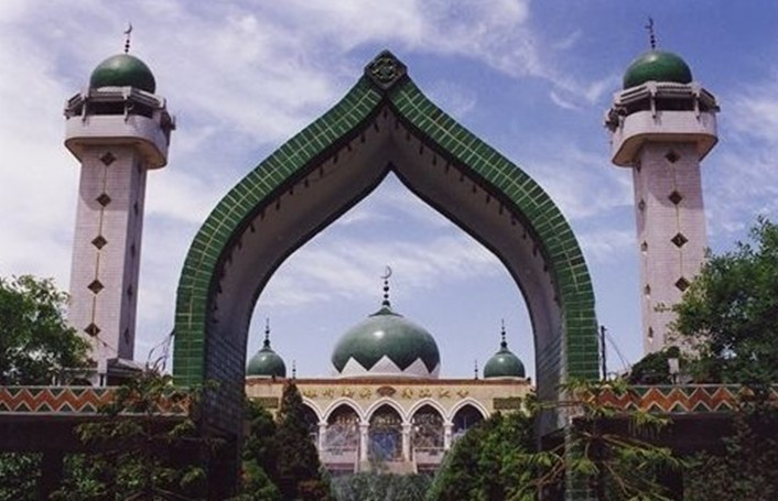 中國伊斯蘭教清真寺。位于寧夏回族自治區(qū)銀川市南關。據(jù)傳原寺始建于明朝末葉,系一中國古典式建筑群。規(guī)模宏大,布局嚴整。禮拜大殿有前廈后室。殿堂門窗為紅松木,雕刻工藝精美。南北廂房布置得體。“文化大革命”中被拆毀。1981年8月重建。新建寺面積為2074平方米,分上下兩層。禮拜大殿設于樓上,呈正方形,長寬各21米,宏偉壯麗。中部有綠色瓷磚飾面的4根方柱,殿頂為直徑9.5米的巨型穹頂。穹頂?shù)撞颗c方柱之間為一段圓柱體的鼓座,上開24扇高窗,寬敞明亮,視野開闊。穹頂正中高懸月形燈,跨地面22米,高聳入云。下層為小禮拜殿、男女沐浴室、會客室、宿舍等。其間有回廊相連,自成一體。整個建筑典雅華美,莊重宏偉,呈現(xiàn)出典型的阿拉伯建筑特色。