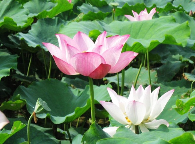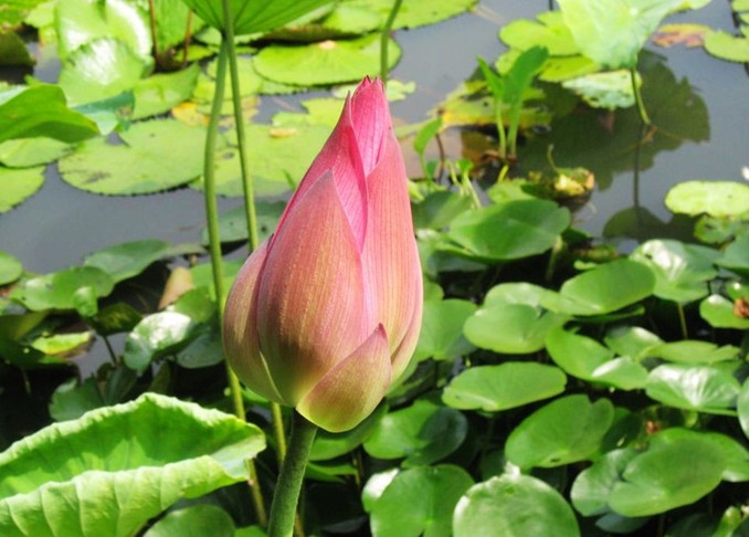 站在青石砌成的觀賞臺上,憑欄而觀,仿佛是綠波蕩漾中的一葉小舟,在此起彼伏的一片荷海中,隨波輕漂,粉霞點點,宛如天成的錦繡。怒放者有之,含苞者有之,傲然挺立者有之,含羞隱藏者有之,形態(tài)各異,各種風姿盡收眼底。