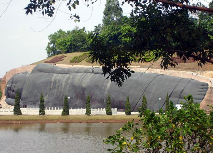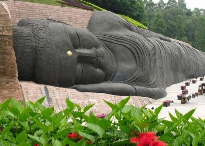 大臥佛位于森林公園天仙巖。相傳當(dāng)年佛教大師六祖惠能傳教后深夜經(jīng)過這里,看到天仙巖靈光閃爍,隱約可見這塊橫臥的大石塊就是一個(gè)大臥佛,六祖立即跪拜,求佛祖降福天下。大臥佛的雕造從這個(gè)傳說獲取靈感,以盛唐敦煌臥佛為范本,佛身長108米,尺度堪稱世界之最?,F(xiàn)經(jīng)改造用紫銅包裝大臥佛,成為金裝大臥佛。大佛前面是錦鯉池和荷花池,與大佛相互映襯引人入勝。大佛對(duì)岸一層為長六十米的長廊,廊內(nèi)彩繪佛傳故事,二層為敬佛臺(tái),憑欄對(duì)拜,大佛全景一覽無遺。
