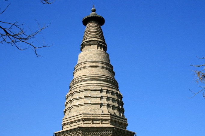 宏佛塔是一座外形結(jié)構(gòu)比較奇特的密檐式厚壁空心磚塔。塔身和塔剎高度相近,通高約25米。塔身3層,平面八角形。第一層南面辟一高為2.4米的券門,門楣上端兩側(cè)磚雕龍、鳳圖案。塔身每層上下有雙重檐,檐下雕兩組斗栱。
