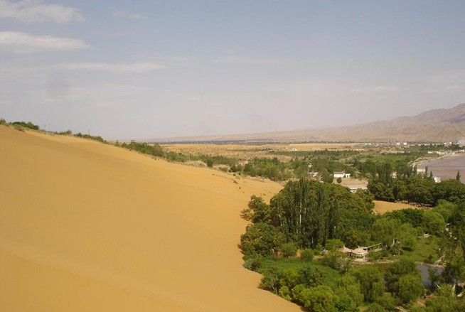 沙坡頭有中國最大的滑沙場,近200米長,垂直高度80多米的沙坡。倘若天氣晴朗,氣溫升高之時(shí),從沙坡頂向下滑,坡內(nèi)便發(fā)出嗡嗡的轟鳴聲,仿佛金鐘長鳴,因此這里享有“沙坡鳴鐘”的美譽(yù),成為中國的四大響沙之一。