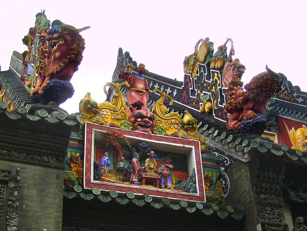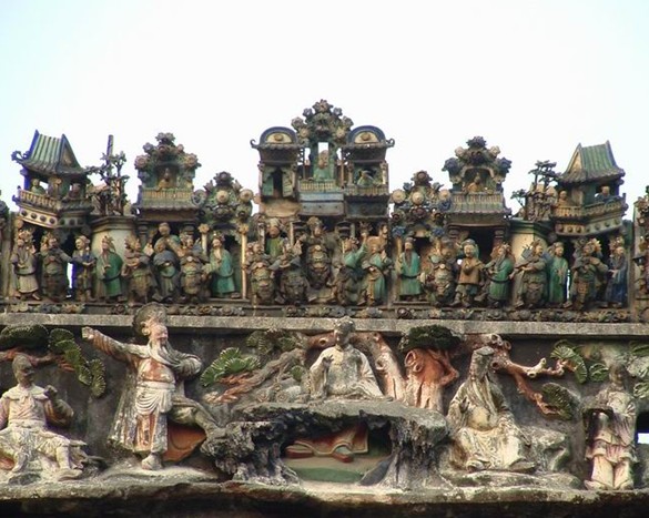 陳氏書院的陶塑五彩繽紛,琳瑯滿目,令人目不暇接。書院的正脊采用佛山陶塑共11條。首進(jìn)5條和聚賢堂脊飾分別于光緒十七年(1891年)(聚賢堂脊飾 于1976年被臺風(fēng)刮倒,于1981 年重塑)和十九年(1893年)燒制,中、后進(jìn)的4條脊飾于光緒十八年(1892年)燒制,后進(jìn)大廳的脊飾則完成于光緒十六年(1890年)。11條脊飾中以聚賢堂的規(guī)模最大,其總長27米,高2.9米,連灰塑基座總高達(dá)4.26米。全脊共塑224個(gè)人物,題材包括八仙賀壽、加官進(jìn)爵、虬髯客與李靖等,整條脊飾恰似一個(gè)巨大的舞臺。其他脊飾的題材主要是龍鳳、花鳥、瑞獸、山水以及歷史故事和人物群像等。