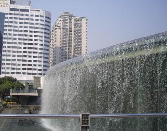 廣州火車東站及其廣場位于新城市中軸線的北段,東站綠化廣場以大面積的綠地營造了一個大尺度的環(huán)境空間效果,配以精致的花壇、雕塑、水景,體現(xiàn)了廣州現(xiàn)代化國際城市的都市風(fēng)采。長89米、高8米的玻璃墻構(gòu)成了水景瀑布的依托,流水從高平臺溢出,順玻璃墻瀉入水池,各色燈光不斷變幻將瀑布映得五顏六色。