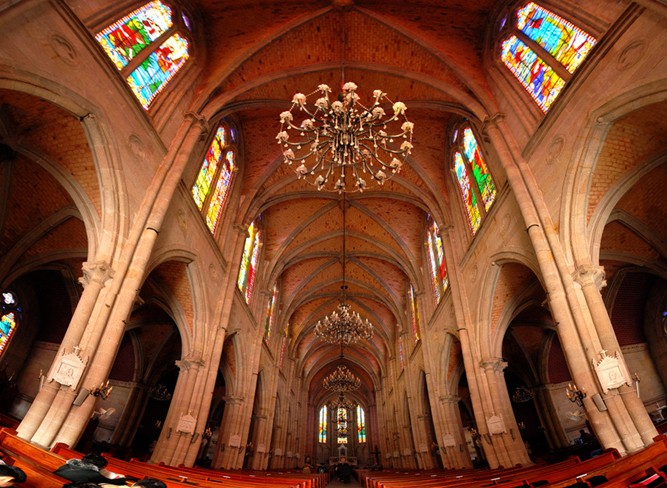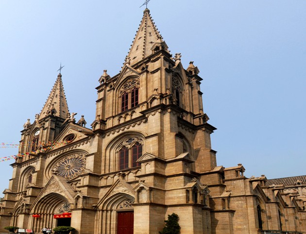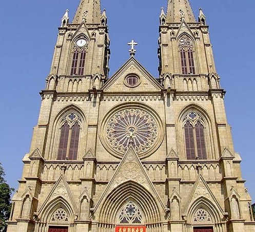該教堂正面是一對高聳的尖頂石塔,象征升向天堂,皈依天主;石塔中間西側(cè)是一座大時鐘,石塔中間東側(cè)是一座大鐘樓,裝有四具從法國運來的大銅鐘;西邊鐘樓的西、南、北三個塔面安裝有羅馬字鐘面的時鐘,東邊鐘樓內(nèi)懸掛著以圣母瑪利亞命名的銅鐘組;正立面的鐘樓上聳立尖塔,是哥特式教堂建筑風(fēng)格的特征,也是建筑造型藝術(shù)魅力的內(nèi)是尖形肋骨高叉的拱形穹窿;正面大門上面和四周墻壁分布的花窗欞,都是合掌式,所有門窗都以法國制造的較深的紅、黃、藍(lán)、綠等七彩玻璃鑲嵌。這玻璃可避免室外強光射入,使室內(nèi)光線終年保持著柔和,形成慈祥、肅穆的宗教氣氛。充分展現(xiàn):尖塔為空心的八角形錐體,用石塊砌成,其下是三層樓房,尖塔越往上越陡峭,最后像錐尖刺向蒼穹。
