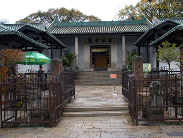 五仙觀位于惠福西路?,F(xiàn)寺觀建于明洪武七年(1337年),是一座祭祖五仙的谷神廟。該觀屬道教寺廟,寺坐向南,門上大匾上有清人書寫的“五仙大觀”四個大字。五仙觀依山而建,現(xiàn)存有頭門、后殿、東齋與西齋。五仙觀為綠琉璃瓦重檐歇山頂,木構(gòu)架保存完好,玲瓏新巧。后殿東側(cè)裸露的一塊紅砂巖,上有巨大的腳印凹穴,古人一向認(rèn)為這是“仙人拇跡”,重點保護(hù)下來。明清兩代,這里分別以“穗石洞天”和“五仙霞洞”列入羊城八景。