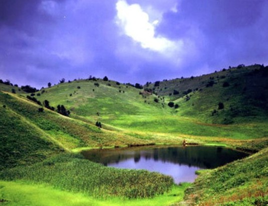 史書載:“水池寬數(shù)畝,且終年渾濁,若投石,頃刻大雨,故名神田”。神河源不足千米,河道峰回路轉(zhuǎn),99道灣和神田草原99個(gè)山包形成一道絕妙的參照系。土包之間形成了大小不等的32塊草坪,10多個(gè)水池,最大的草坪約有1000至2000畝。最大的水池約有3000平方米。奇怪的是這里周圍都是石山,唯獨(dú)草原上是深厚的土地,幾乎不見石頭,人走在草地上有如踏在海綿上一樣松軟。