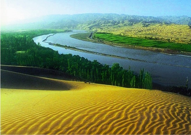 這里有中國(guó)最大的天然滑沙場(chǎng),有總長(zhǎng)800米、橫跨黃河的“天下黃河第一索”--沙坡頭黃河滑索,有黃河文化的代表一一古老水車,有中國(guó)第一條沙漠鐵路,有黃河上最古老的運(yùn)輸工具——羊皮筏子;有沙漠中難得一見(jiàn)的海市蜃樓可以騎駱駝穿越騰格里沙漠,可以乘坐越野車沙海沖浪,咫尺之間可以領(lǐng)略大漠孤煙、長(zhǎng)河落日的奇觀。黃河南岸是一塊三面環(huán)沙,一面靠山的“U”半島,這里地形優(yōu)越,景觀奇特,民俗淳樸,資源豐富,可以在演繹中心觀看具有異域風(fēng)情的、民族特色的歌舞表演,可以住宿黃河塞上人家干農(nóng)家活、吃農(nóng)家飯、睡農(nóng)家炕、享農(nóng)家樂(lè);濱河浴場(chǎng)可以體驗(yàn)?zāi)赣H河的沐浴,秦代長(zhǎng)城和陶窯在這里留下了千古不朽的遺址。
