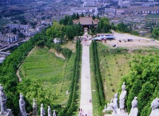 穿過祭祀?yún)^(qū),便進(jìn)入墓冢區(qū)。沿著長長的陵道拾級而上,兩邊塑立著百代帝王石像,總共16位,依歷史順序依次排列為:堯、舜、禹、啟、夏桀、成湯、盤庚、紂王、周文王、周武王、周幽王、周平王、鄭莊公、齊桓公、秦穆公、宋襄公等。