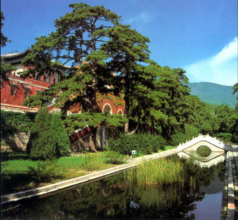 位于武當(dāng)山東南的展旗峰下,始建于北宋宣和年間(公元1119一1125年),明永樂(lè)十一年(公元1413年)重建,明嘉靖三十一年(公元1552年)擴(kuò)建,清嘉慶八年至二十五年(公元1803—1820年)大修,是武當(dāng)山八大宮觀(guān)中規(guī)模宏大、保存完整的道教建筑之一。現(xiàn)存有建筑29棟,建筑面積6854平方米。中軸線(xiàn)上為五級(jí)階地,由上而下遞建龍虎殿、碑亭、十方堂、紫霄大殿、圣文母殿,兩側(cè)以配房等建筑分隔為三進(jìn)院落,構(gòu)成一組殿堂樓宇、鱗次櫛比、主次分明的建筑群。宮的中部?jī)梢頌樗暮显菏降牡廊司铀?。宮內(nèi)主體建筑紫霄殿,是武當(dāng)山最有代表性的木構(gòu)建筑,建在三層石臺(tái)基之上,版權(quán)所有聊城聊之旅旅行社有限公司,轉(zhuǎn)載必究!臺(tái)基前正中及左右側(cè)均有踏道通向大殿的月臺(tái)。大殿面闊進(jìn)深各五間,高18.3米,闊29.9米,深12米,面積358.8平方米。共有檐柱、金柱36根,排列有序。大殿為重檐歇山頂式大木結(jié)構(gòu),由三層崇臺(tái)襯托,比例適度,外觀(guān)協(xié)調(diào)。上下檐保持明初以前的做法。柱頭和斗栱顯示明代斗杠的特征。梁架結(jié)構(gòu)用九檀,高寬比為5:2.5,保持宋遼以來(lái)的用材比例。殿內(nèi)金柱斗栱,施井口天花,明間內(nèi)槽有斗八藻井。明間后部建有刻工精致的石須彌座神龕,其中供玉皇大帝,左右肋侍神像,均出自明人之手。