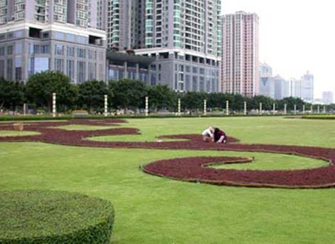 天河東站綠化廣場位于廣州市新城市軸線上,占地面積4.7萬平方米,于1998年9月中旬動工,1999年7月1日正式完成并交付使用。廣場中央綠地2.6萬平方米,鋪種馬尼拉草18315平方米,其中有6000平方米種植標志性的紋樣,分圍種植1300平方米的福建茶綠籬。