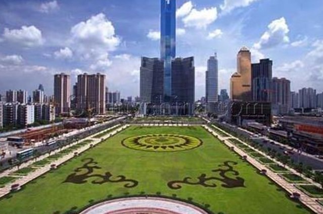 廣場的南面是廣州第一高樓中信廣場。中信廣場的主體建筑中信商業(yè)大廈是一棟甲級智慧型的商廈:主樓大堂入口處卓爾超凡,大堂樓高17.7米,配襯著優(yōu)質花崗巖石,顯得格外富麗堂皇。除主樓外,兩翼還有藝術對稱的兩棟38層副樓以及5層裙樓(為中天購物城)。平面看來,主樓四方形,中天購物城的5層裙樓,呈半圓形,左右副樓則像電視卡通片人物伸出來的左手臂和右手臂。