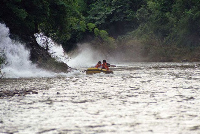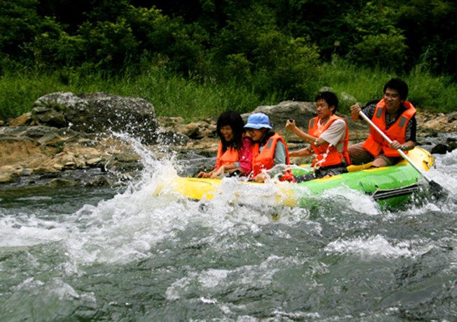 參加者坐上雙人漂流筏親自掌舵,投入大自然的懷抱隨水逐流,感受八公里激流險(xiǎn)灘連綿不斷的冒險(xiǎn)旅程。行程時(shí)而處于緩水中,此時(shí)你可盡情享受青山、綠水、藍(lán)天為您帶來的賞心悅目,或與同伴潑水嬉戲,其樂悠悠,但您千萬別太陶醉,因?yàn)橄獫居胁簧偌绷麟U(xiǎn)灘,漂流者必須守望相助才能勇闖過去。