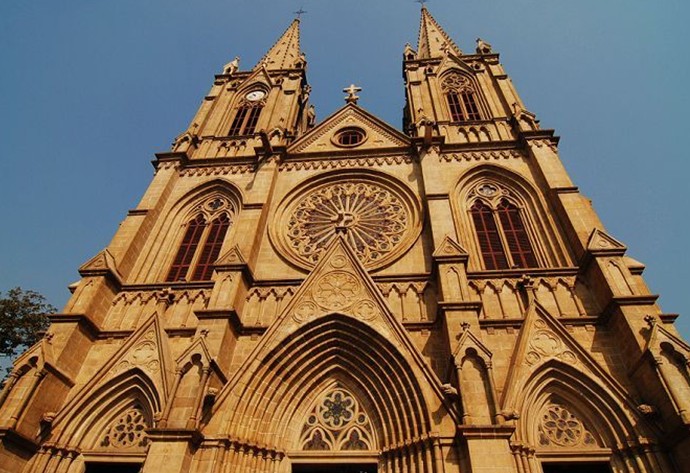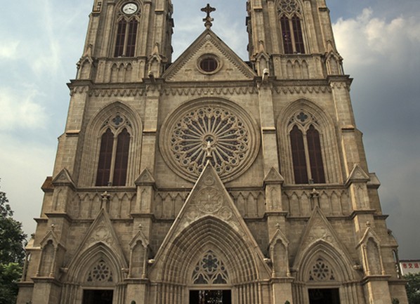 廣州石室天主教堂在市區(qū)一德路,清同治二年奠基,光緒十四年落成,歷時(shí)二十五年,是全國(guó)最大的一座以高直尖頂為特色的哥特式教堂。教堂結(jié)構(gòu)為一巍峨高聳的雙尖石塔,其上掛有大鐘一組,堂深78.69米,東西寬35米,高度由地面至天面平臺(tái)為28.7米,由天面平臺(tái)至塔頂端為29.8米,共高58.5米,堂內(nèi)是尖形肋骨尖叉的拱形穹窿,正面的大門和四周玻璃鑲嵌,可避免室外強(qiáng)光射入,使室內(nèi)光線保持柔和。