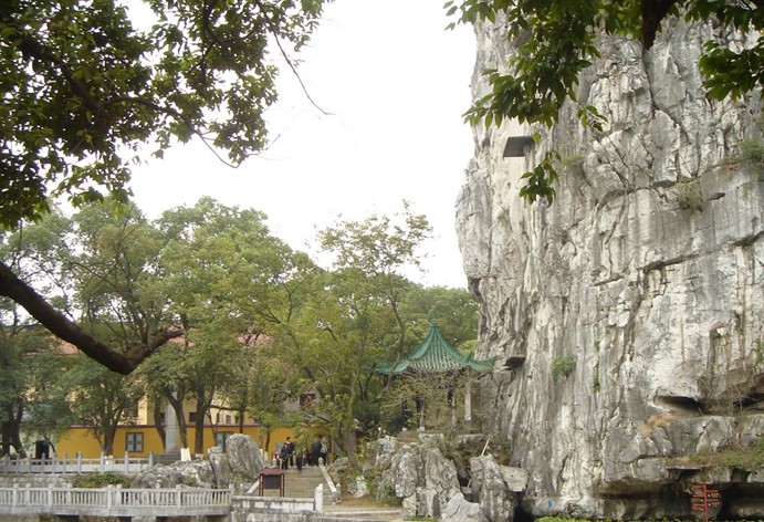 位于市中心以靖江王城內(nèi), 孤峰突起, 陡峭高峻, 氣勢雄偉, 素有“南天一柱”之稱。山東麓有南朝劉宋時文學(xué)家顏延元讀書巖, 為桂林最古老的名人勝跡。顏曾寫下“未若獨秀者, 峨峨郛吧間”的佳句, 獨秀峰因此得名。假當(dāng)晨曦輝映或晚霞夕照, 孤峰似披紫袍金衣, 故又名紫舍山。